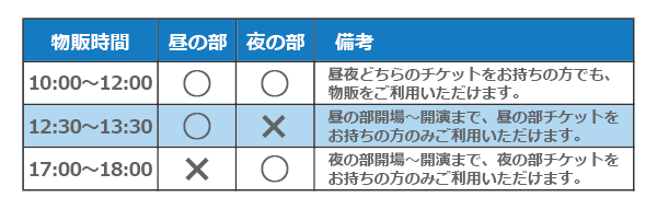 ※各公演、開場から開演前は混雑が予想されます。できるだけ12:00までに物販のご利用をお願いいたします。