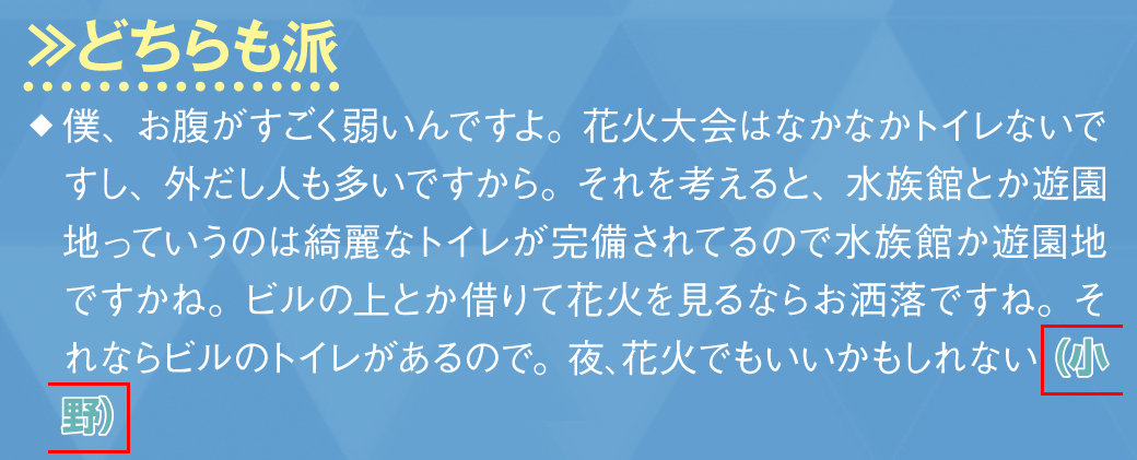 ◆A4判パンフレットの31ページに掲載されている「キャストの皆さんにアンケート! あなたはどっち?」コーナーの右最下段の話者名が誤って掲載されておりました。正しくは下記のとおりです。