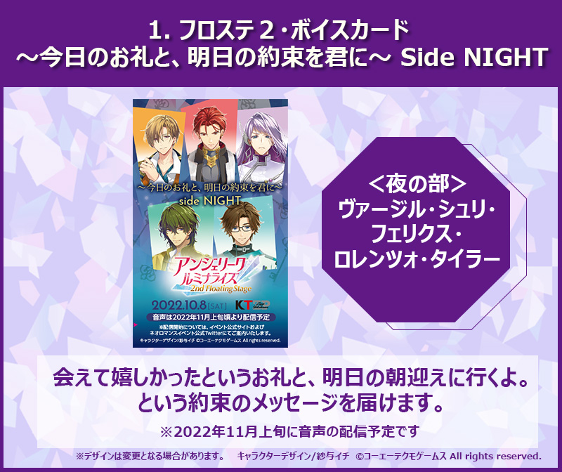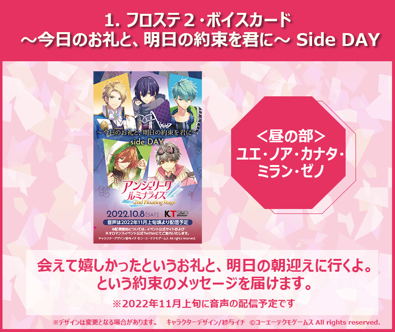 ・会場内にある特典引換コーナーにて、引換券と交換でお渡しいたします。電子チケットの方は、引換券を係員にお見せください。・特典の引換は、各公演の開場から開演時間までとさせていただきます。昼夜どちらの特典も引き換えできます。