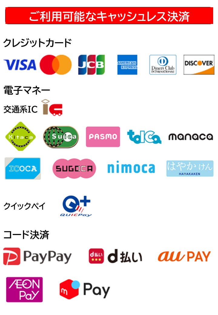 お支払いに関しましては、現金以外に以下がご利用いただけます。<ご利用可能キャッシュレス決済>