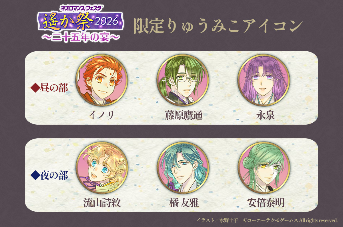 - ※源 頼久、森村天真、アクラムのアイコンは『遙かなる時空の中で 龍宮の神子』3月15日限定の「遙か祭2026開催記念 限定ログインボーナス」で配布予定です。
