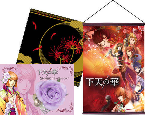 話題沸騰のネオロマンスゲーム新作『下天の華』の発売を記念した、別売りのA2タペストリーとクリーナークロスに加えヒロインが姫に変化(へんげ)したときに身につけるバラの飾りをイメージしたコサージュクリップの豪華3点セット!