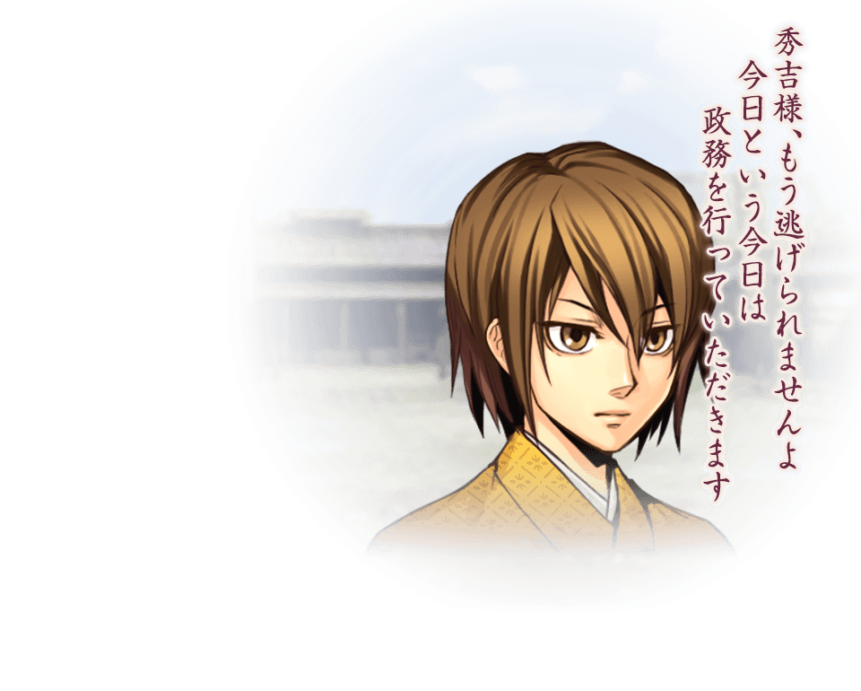 [サブキャラクター] 秀吉の小姓。聡明で礼儀正しく、凜とした態度が印象的。 政務を怠けがちな秀吉をよく諫めている。 まれに、年相応の笑顔や慌てぶりを見せることも。 『下天の華 with 夢灯り 愛蔵版』サンプルボイス
