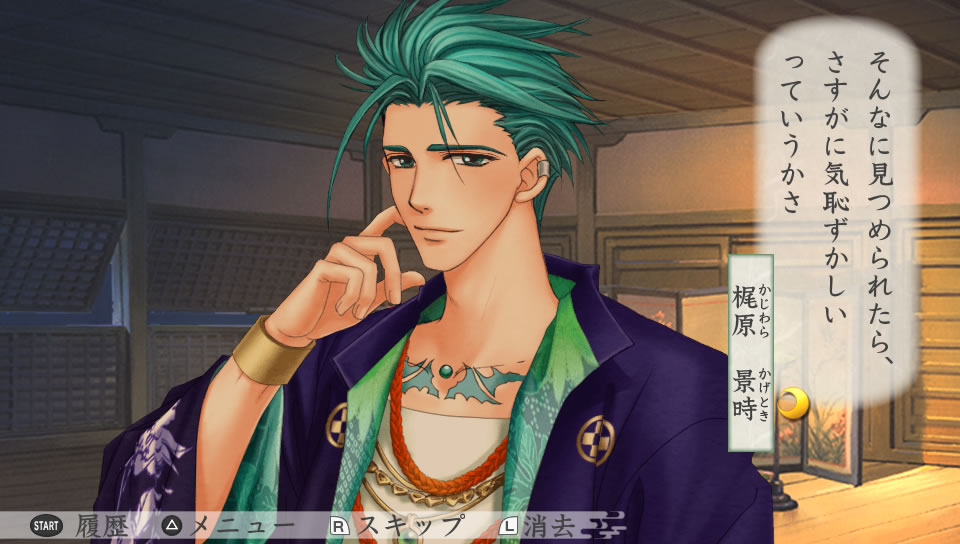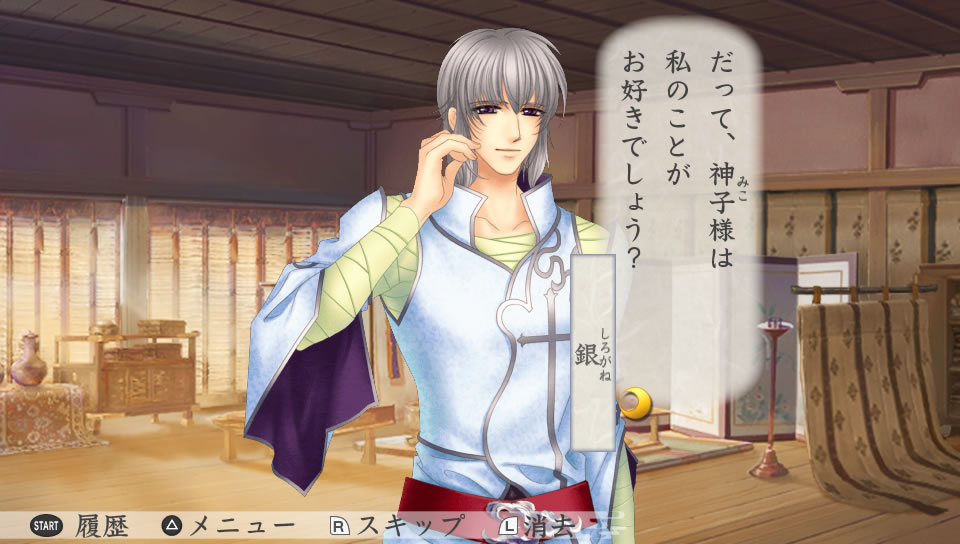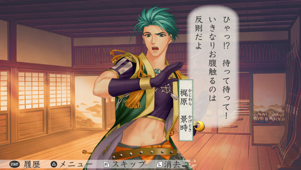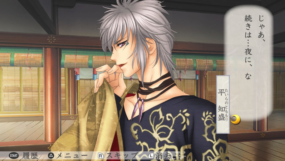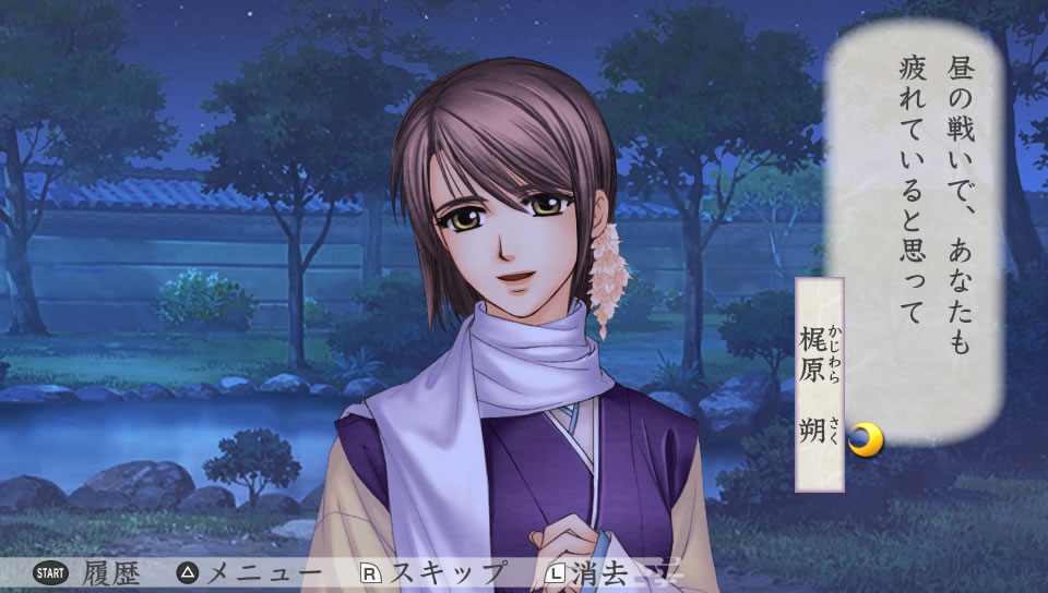 夜に景時の部屋を訪ねた主人公。書物を読んでいる景時に、そっと近づいて顔を覗き込む。