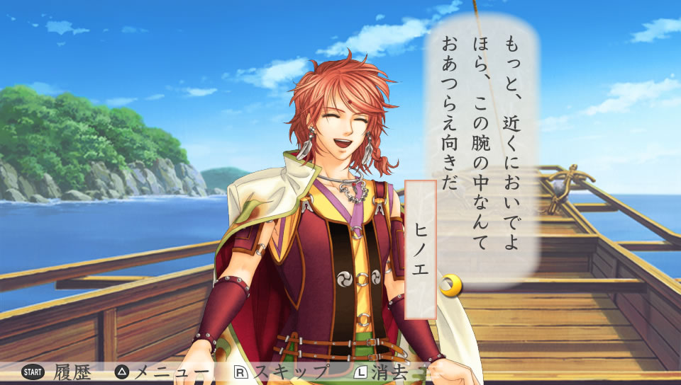 小さな船で波に揺られる二人。いつもの船よりもお互いを近く感じて照れる主人公と、いつもと変わらないヒノエ。