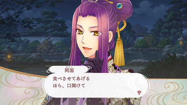 月見酒を楽しむ二人を見つけた主人公。手作りの団子を差し出す幸村に、阿国が「抜け駆けだ」と言い出して……。
