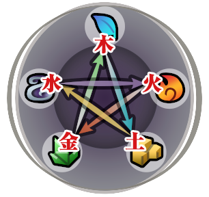 各キャラクターや敵は、いずれかの属性があります。属性には、木、火、土、金、水 の5種類があり、まとめて五行属性と呼びます。