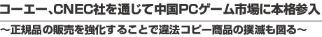 株式会社コーエー(本社:神奈川県横浜市、代表取締役社長:小松清志、以下コーエー)は、2007 年春より、北京中視网元娯楽科技有限公司(本社:中国北京市、董事長:孟 憲明、以下CNEC)を通 じて、中国全土におけるパソコン用ゲームソフトの販売を開始いたします。