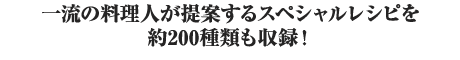 帝国ホテルをはじめ、和食や中華の名店の料理長が本作のためにアレンジした特別な家庭料理を約200種類収録しています。さらに、料理長秘伝のテクニックをわかりやすく解説した「料理長のアドバイス」や、料理に関する知識をまとめた「料理事典」などを収録。名店ならではのスペシャルレシピとテクニックで、ワンランク上の家庭料理をお楽しみいただけます。