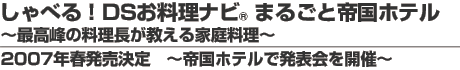 日本を代表する帝国ホテルから、最高峰の料理長がお贈りするニンテンドーDS®用レシピを多数収録したお料理ソフト 『しゃべる!DSお料理ナビ® まるごと帝国ホテル 〜最高峰の料理長が教える家庭料理〜』 を2007年春に発売いたします。