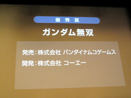 コンテンツ産業と、その周辺技術に関する産業創出と経済の活性化に寄与するものとして、株式会社バンダイナムコゲームスと株式会社コーエーによるPLAYSTATION 3用ソフト『ガンダム無双』 が優秀賞に選出されました。