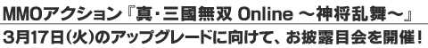 このたび、2009 年 3 月 17 日(火)よりアップグレードする拡張パック 『真・三國無双 Online ~神将乱舞~』(シンショウランブ) につきましてお披露目会を開催いたしました。