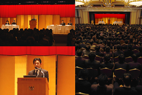 会場となった帝国ホテル富士の間に集った1200人の社員。グループの新入社員紹介もここで行われました。 |