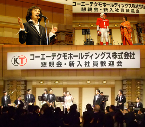 「新たなチャレンジ」 をテーマに結成された役員バンドは 『イパネマの娘』 『想い出の渚』 『ダイアナ』 の3曲を披露。メンバーは、前列左から執行役員 原毅、代表取締役社長 松原健二、代表取締役会長 柿原康晴、 取締役 襟川恵子、取締役 阪口一芳、執行役員 伊従勝(以上ボーカル担当)。 後列左から、ドラム担当・執行役員 小林伸太郎、ベース担当・取締役 襟川陽一、ギター担当・コーエー常務執行役員 保坂正敏、ギター担当・コーエー執行役員 真保安一郎、キーボード担当・執行役員 杉山芳樹。