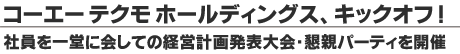 コーエー、テクモ両社の力を融合し、実りあるシナジーを生み出していくためには、社員の相互理解と、積極的な交流が欠かせません。 前半 「経営計画発表大会」 では、グループ全体の経営理念・戦略からコーエー、テクモそれぞれの経営戦略まで、詳細な説明が行われました。 また、後半 「懇親会・新入社員歓迎会」 では、パーティ会場を埋め尽くした社員同士で大いに語らい、「世界No.1のエンターテインメント」 の創発に向けて、気概を新たにする場となりました。