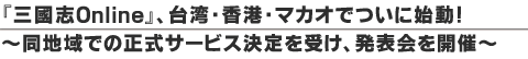 当社が開発いたしましたWindows用MMORPG 『三國志 Online』 につきまして、2009年7月3日よりオープンβテストを、 更に2009年8月3日より正式サービス(課金)を、 台湾・香港・マカオ地区にて開始することが決定いたしました。