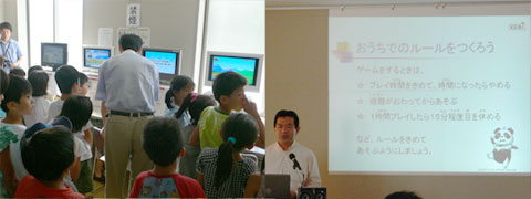 内容は 「ゲームクリエーターの仕事紹介」、 「ゲームを安全に楽しむ方法・レーティング講座」 「親子でのゲームプレイ体験」 の三部構成で、 コーエー代表取締役社長と開発スタッフによるプレゼンテーションを、 みなさん興味深く聞き入っていらっしゃいました。
