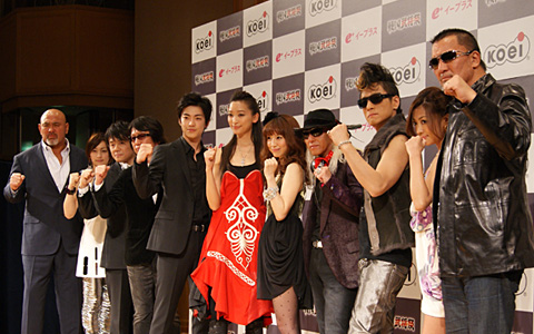 発表会では、『戦国無双3』 で織田信長役をつとめた声優 小杉十郎太さん、そして真田幸村役の声優 草尾毅さんによる呼び込みにより、イベントに参加する豪華キャストが紹介されました。総合司会をつとめる杏さん、大東俊介さんのほか、さらに、姫武将として参加する水野裕子さんと次原かなさん、また音楽アーティスト代表として、このイベントのために結成された、鈴木亜美さん、DJ KOOさん、DJ motsuさんのユニット「Phoenix 2:00AM feat.Ami Suzuki」 が登壇しました。