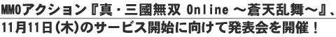 拡張パック第2弾 『真・三國無双 Online ~蒼天乱舞(ソウテンランブ)~』 につきまして発表会を開催しました。 来る2010 年 11月 11日(木)よりサービスを開始いたします。