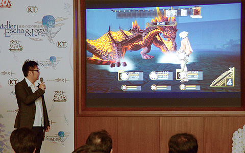 株式会社コーエーテクモゲームスおよび株式会社ガストの代表取締役社長を務める襟川陽一は、冒頭の挨拶で 「ガストは今年20周年を迎えます。 この20周年記念作品の第1作となる 『エスカ&ロジーのアトリエ~黄昏の空の錬金術士~』 は、アトリエシリーズの15番目の作品となります。 先日、「シブサワ・コウ」 としてここで発表会を行った「信長の野望」は、30年をかけて同じ14番目の作品を発売します。」 と挨拶しました。
