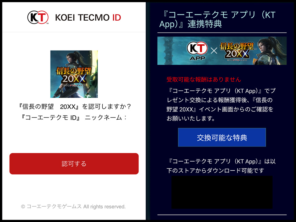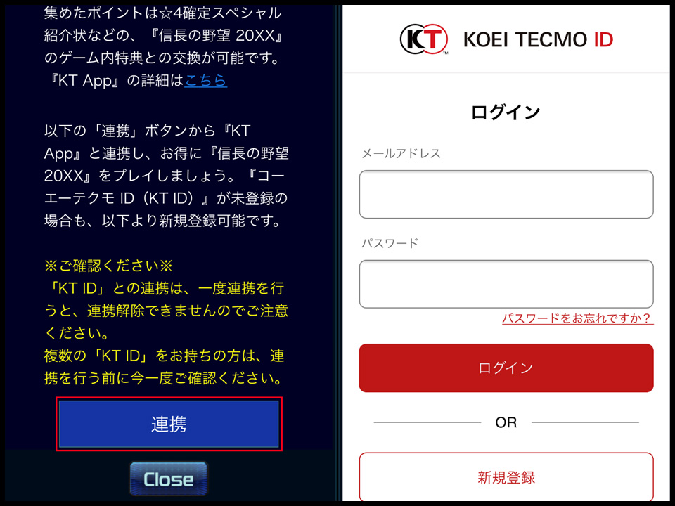 『信長の野望 20XX』と「コーエーテクモ ID(KT ID)」との連携は、一度連携を行うと、連携解除できませんのでご注意ください。複数の「コーエーテクモ ID(KT ID)」をお持ちの方は、連携を行う前に、今一度ご確認ください。