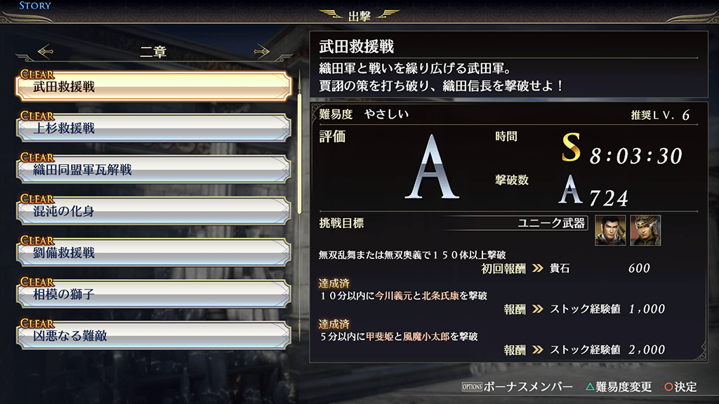 希少石や強力な武器が手に入るようになりますが、控え武将の体力は回復しなくなります。