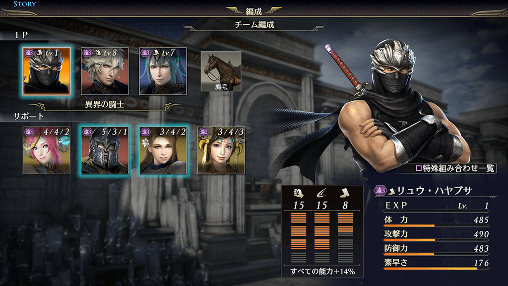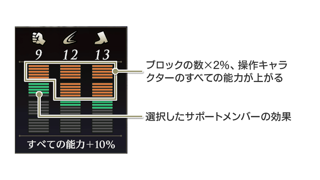 サポートメンバーを設定すると、操作キャラクターの能力が上がります。