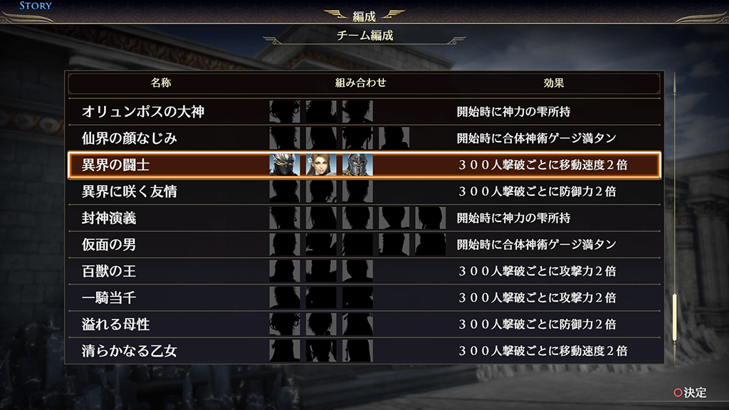 特殊な組み合わせについては、編成画面で確認できます。最初はシルエットのみ表示されますが、一度でも編成した組み合わせはキャラクターが表示されるようになります。