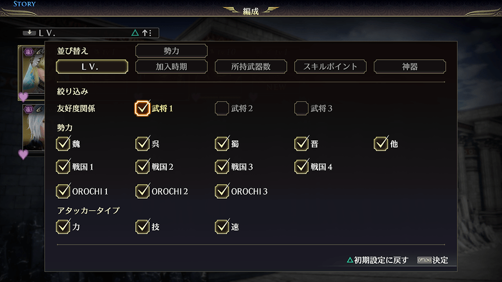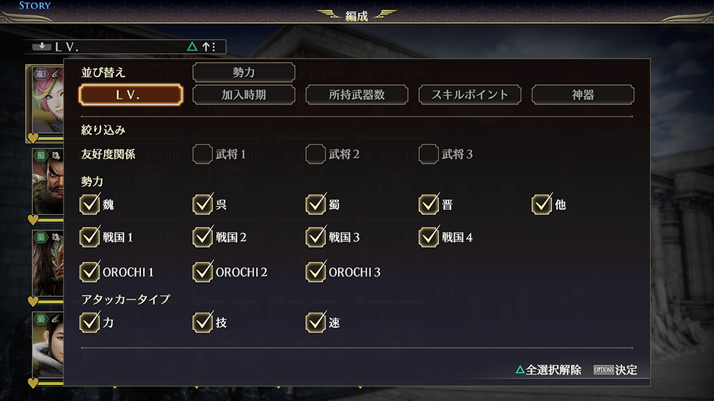 武将一覧でボタンを押すと、キャラクターの並び替え/絞り込みができます。