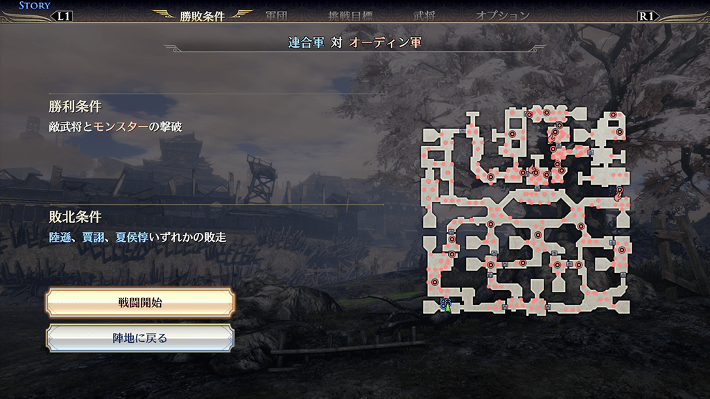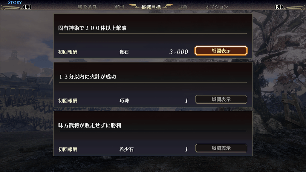 情報画面では、戦場の状況・勝敗条件・挑戦目標を確認できます。