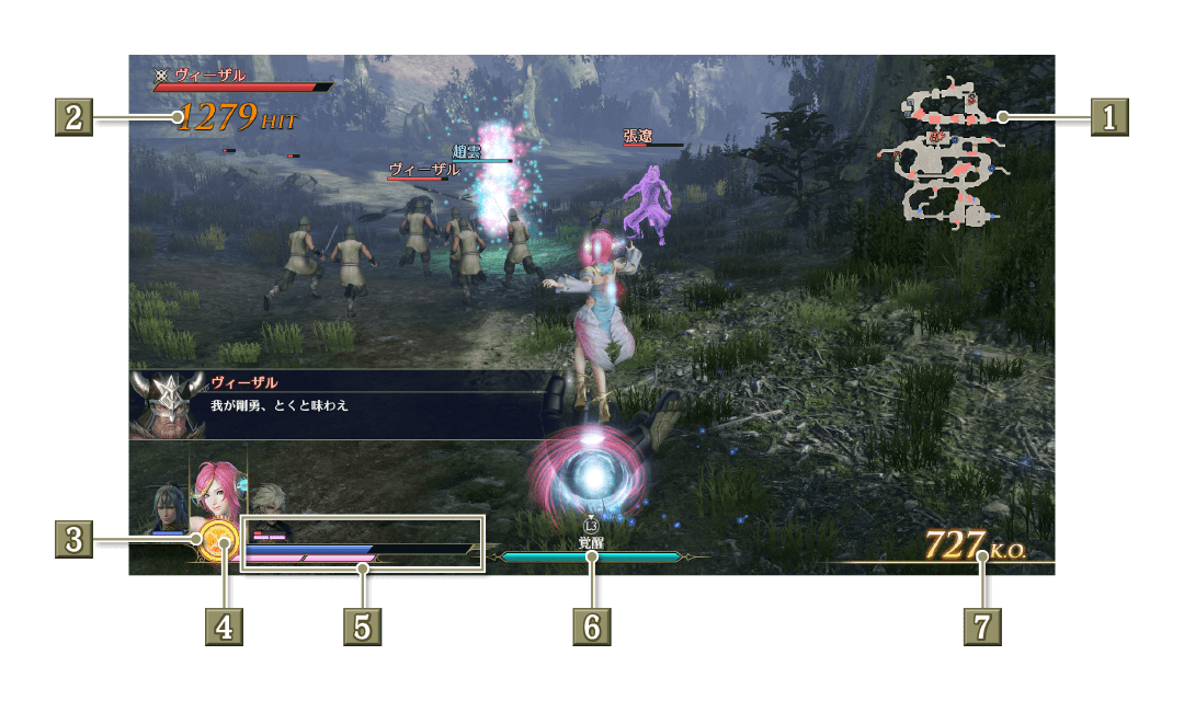 青色のゲージが体力ゲージ、桃色のゲージが無双ゲージです。