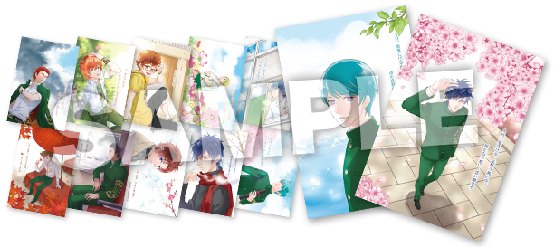 ① 描き下ろしポストカード 12枚組 イベントエンディングのメッセージを、船鬼一夫氏描き下ろしイラストでお届けします。 メッセージ1つにつき1枚。12カ月分のポストカードです。4月長嶺雅紀、5月八木沢雪広、6月火積司郎、7月水嶋新、8月狩野航、9月伊織浩平、10月江波紫音、11月照辺一寿、12月目時文吾、1月阿藤啓太、2月長嶺雅紀、3月八木沢雪広