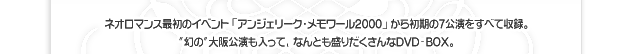 2000年2月27日に開催された初のネオロマンスイベント「アンジェリーク・メモワール2000」から、2002年7月20日、21日に開催された「ネオロマンス・フェスタ3」までの7公演を収めたDVD7枚組BOXの第1弾。