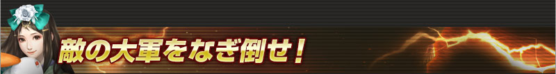 お気に入りの無双武将を操作し、本陣に押し寄せる大量の敵兵や、強力な敵武将、虎戦車や投石車などの強力な兵器を、武将固有の特技や無双乱舞で爽快になぎ倒して勝利を目指せ!