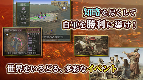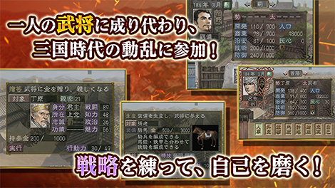 2~3世紀の中国における魏・呉・蜀三国時代を背景に、登場武将の一人となって中国統一をめざす歴史シミュレーションゲームです。