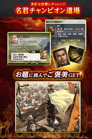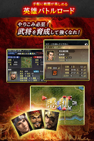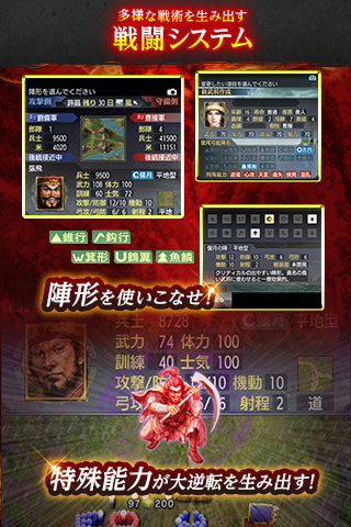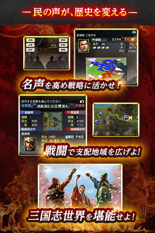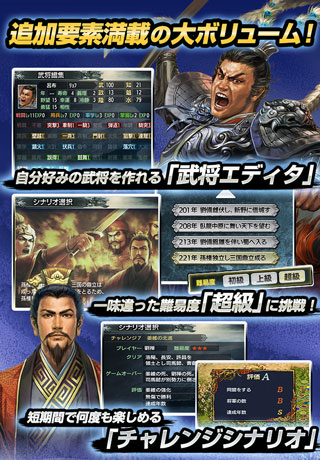 Android 端末向け「三國志」シリーズの前作『三國志 TOUCH』から個性豊かな武将が100 人近く増え、「共同軍」「寝返」「一騎討ち」など計略・外交・戦争面を大幅に強化。