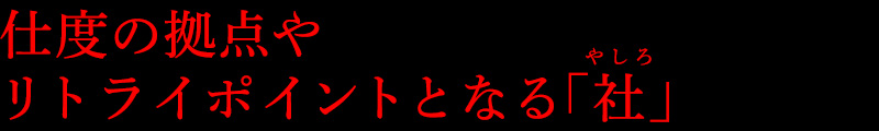 ステージ各所に配置されている「社」では、キャラクターのレベルアップ、「守護霊」の憑けかえなど、プレイに必要なさまざまな仕度を行えます。また、「社」にインタラクトすることで落命時の復活位置も更新されます。