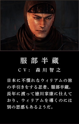 日本に不慣れなウィリアムの旅の手引きをする忍者、服部半蔵。長年に渡って徳川家康に仕えており、ウィリアムを導くのには別の思惑もあるようだ。