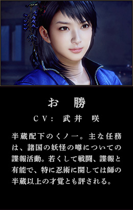 半蔵配下のくノ一。主な任務は、諸国の妖怪の噂についての諜報活動。若くして戦闘、諜報と有能で、特に忍術に関しては師の半蔵以上の才覚とも評される。