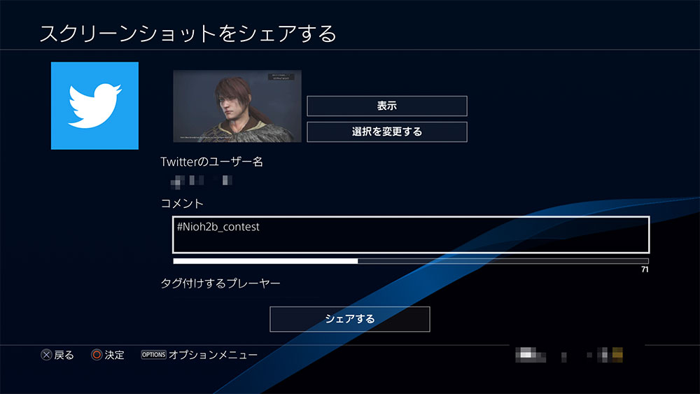 下記の「Twitterへのアップロード手順」に従って、ハッシュタグ「#Nioh2b_contest」をつけてTwitterへ投稿