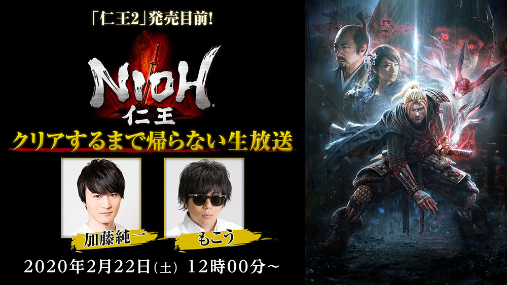 『仁王2』の発売を記念して、2月22日(土)からニコニコ生放送、YouTube Liveにおいて「『仁王2』発売目前!『仁王』クリアするまで帰らない生放送」の実施が決定いたしました。最終体験版直前の3連休に人気ゲーム実況者の「加藤純一」さんと「もこう」さんが『仁王』本編をクリアするまで帰らない企画に挑戦します。放送に合わせて様々なキャンペーンも実施しますので、ぜひご覧ください。