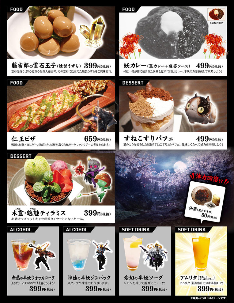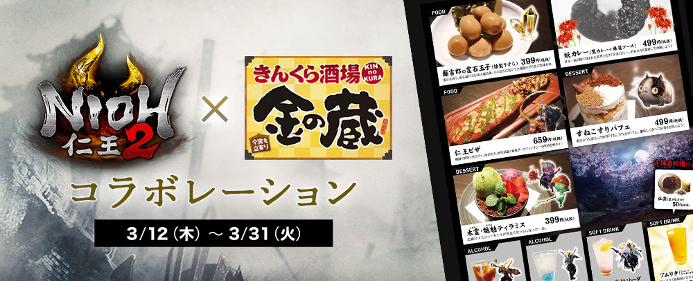 新宿、渋谷、秋葉原、池袋エリアの「金の蔵」計24の対象店舗にて、期間限定で『仁王2』コラボメニューを販売。ゲームの世界観をモチーフにした、計10種のフードやドリンクが登場します。メニュー開発担当者がゲーム内で300回「落命」したのちに誕生した、選りすぐりのメニューが揃っています。