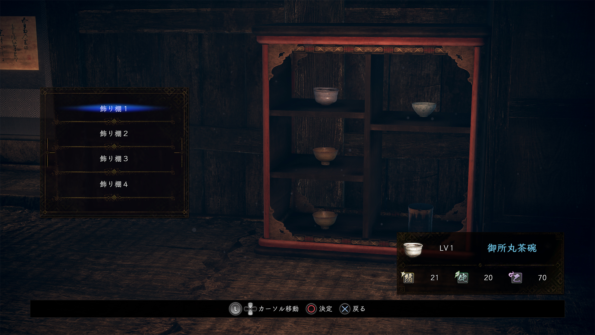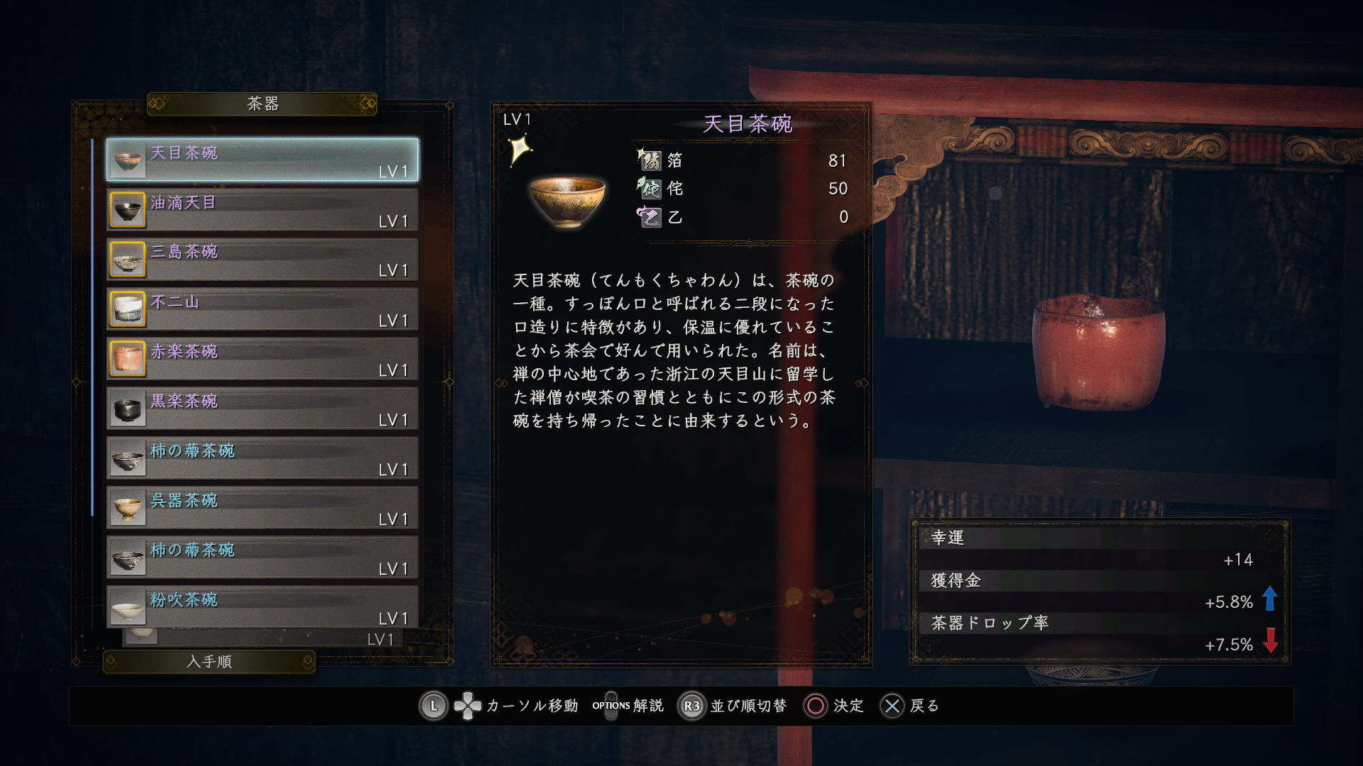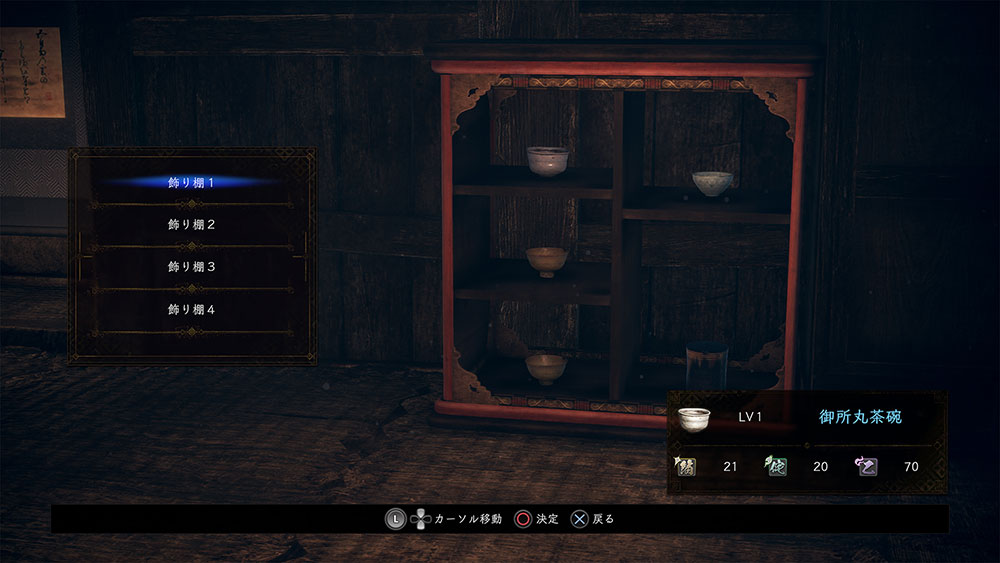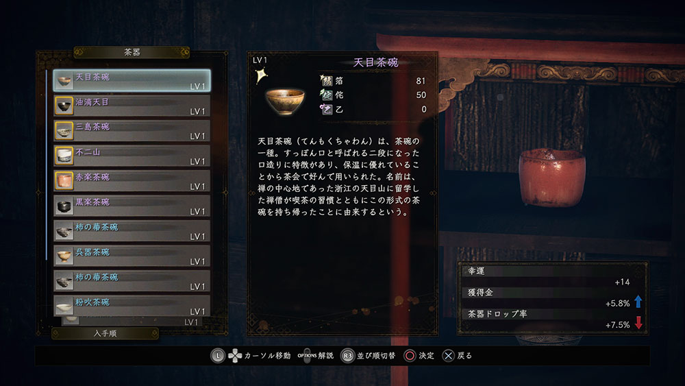 茶器は今作で追加された新しいハクスラ要素。発見したときは未鑑定状態なので、茶室で松永久秀に鑑定してもらう必要がある。久秀の眼鏡に適う品でなかった場合、容赦なく割られてしまう。久秀の審美眼は厳しい。