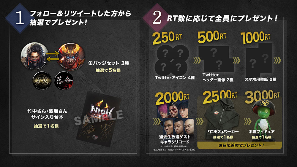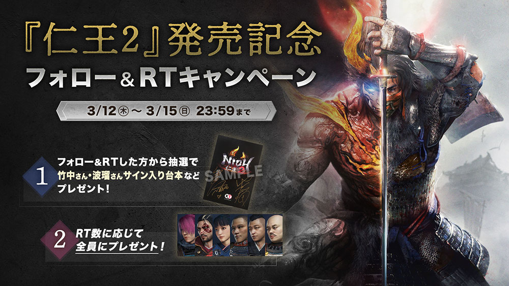 『仁王2』の発売を記念し、フォロー&RTキャンペーンを開催!「『仁王2』公式アカウント(@nioh_game)」をフォローの上、対象ツイートをRTすると抽選で景品が当たるほか、RT数に応じてTwitterアイコンや生放送ゲストのキャラクタークリエイトコードを配布いたします。3000RTを目指し、奮ってご参加ください。