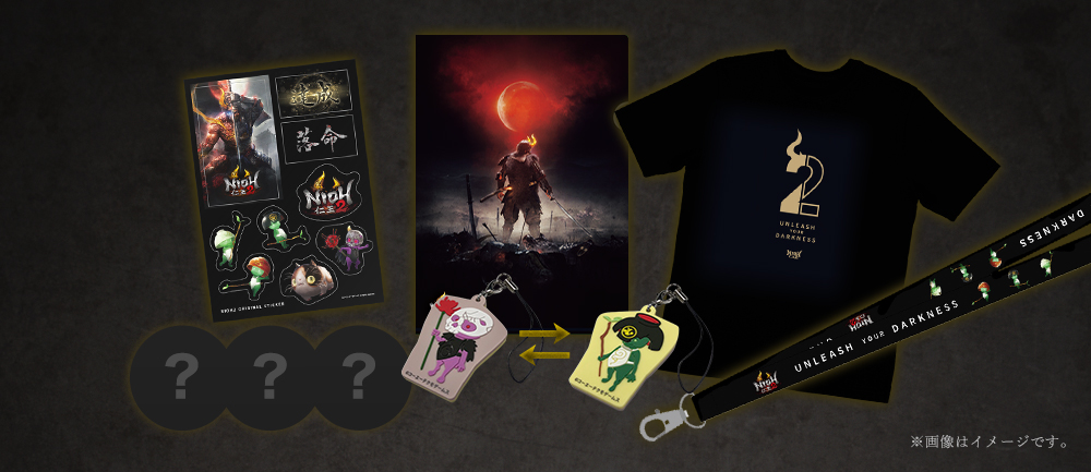 『仁王2』グッズセット ... オリジナルステッカー・A4クリアファイル・木霊/魑魅両面ストラップ・ネックストラップ・オリジナルTシャツ(Lサイズ)・缶バッジ3種 ※