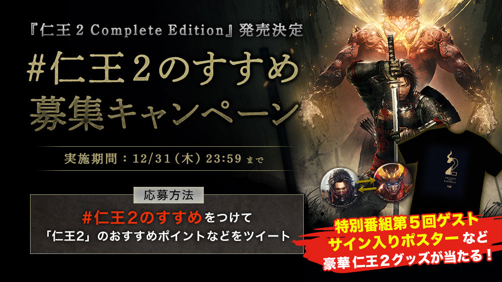 景品には、「特別番組第5回の出演者サイン入り『仁王2 Complete Edition』ポスター(非売品)」や、その他『仁王2』グッズなど豪華景品をご用意しておりますので、奮ってご応募ください。
