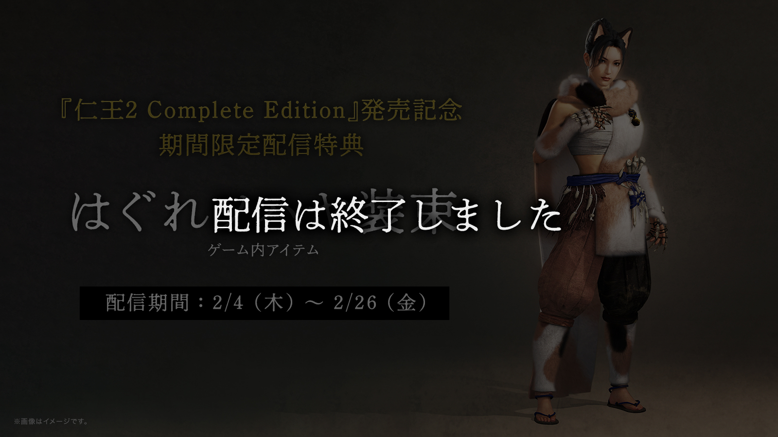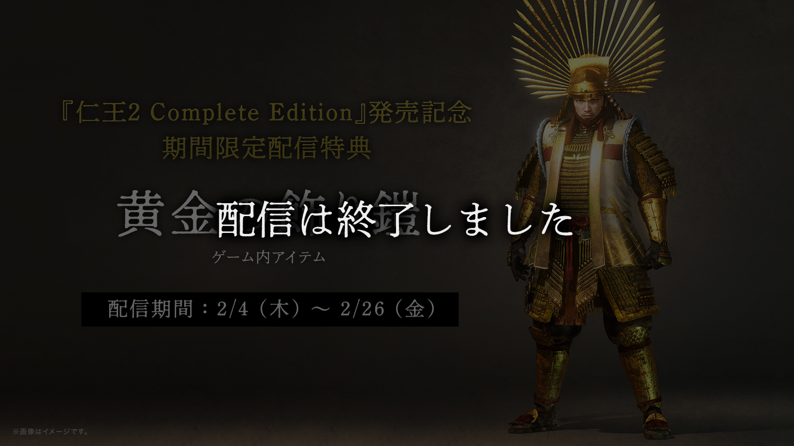 『仁王2 Complete Edition』の発売を記念し、期間限定特典としてゲーム内アイテム「はぐれソハヤ装束」「黄金の飾り鎧」を2021年2月4日〜2月26日の期間限定で配信することが決定しました。期間中に間に合うよう、お早めにお買い求めください。 ご購入はこちら