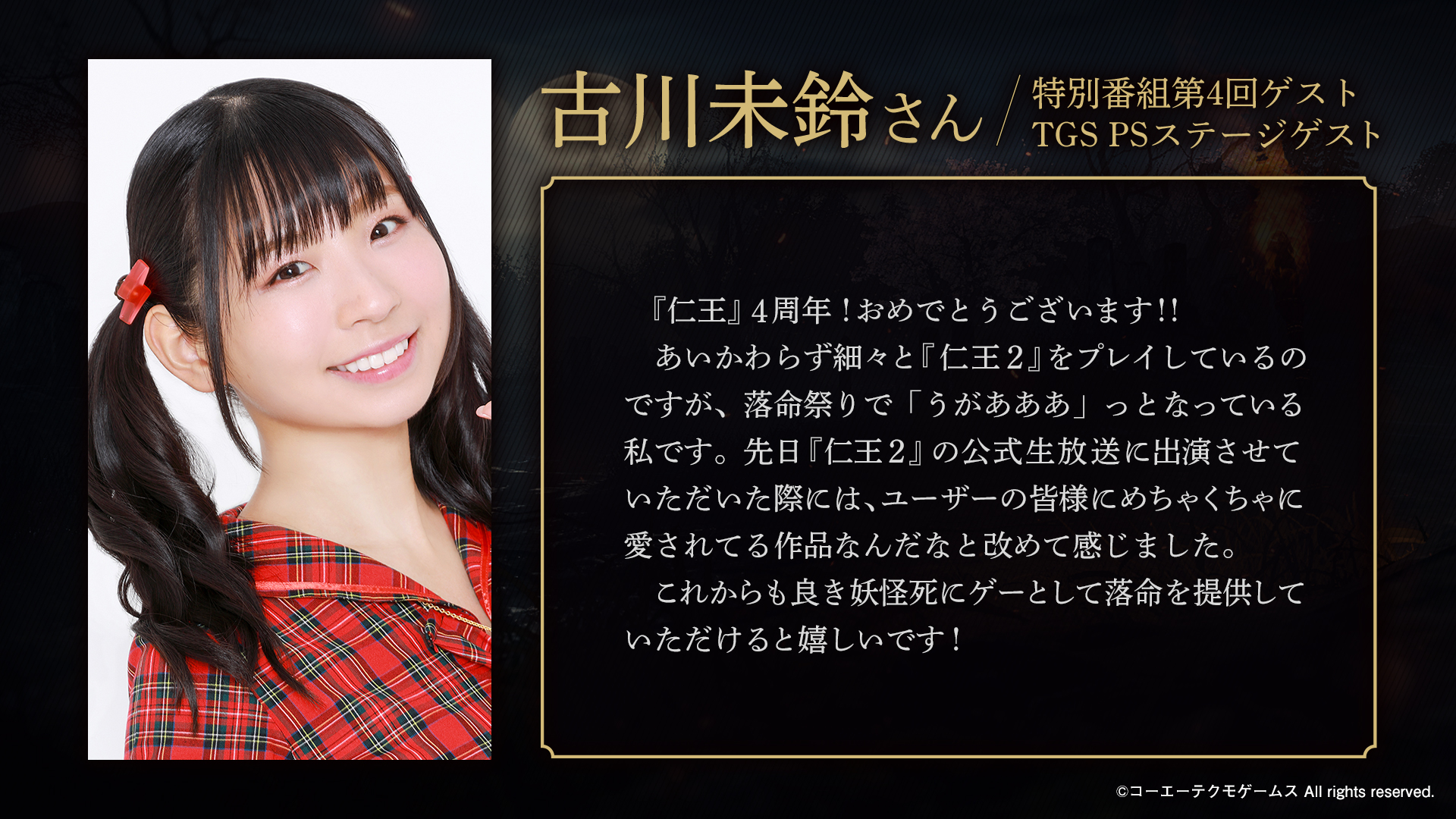 #仁王シリーズ4周年 おめでとうございます! 落命しても、いや落命する度にやる気が出る不思議なゲームでした。2020年は #仁王2 の年。一番遊びました。 公式生放送でもコメントが出て嬉しかったです。ありがとう!