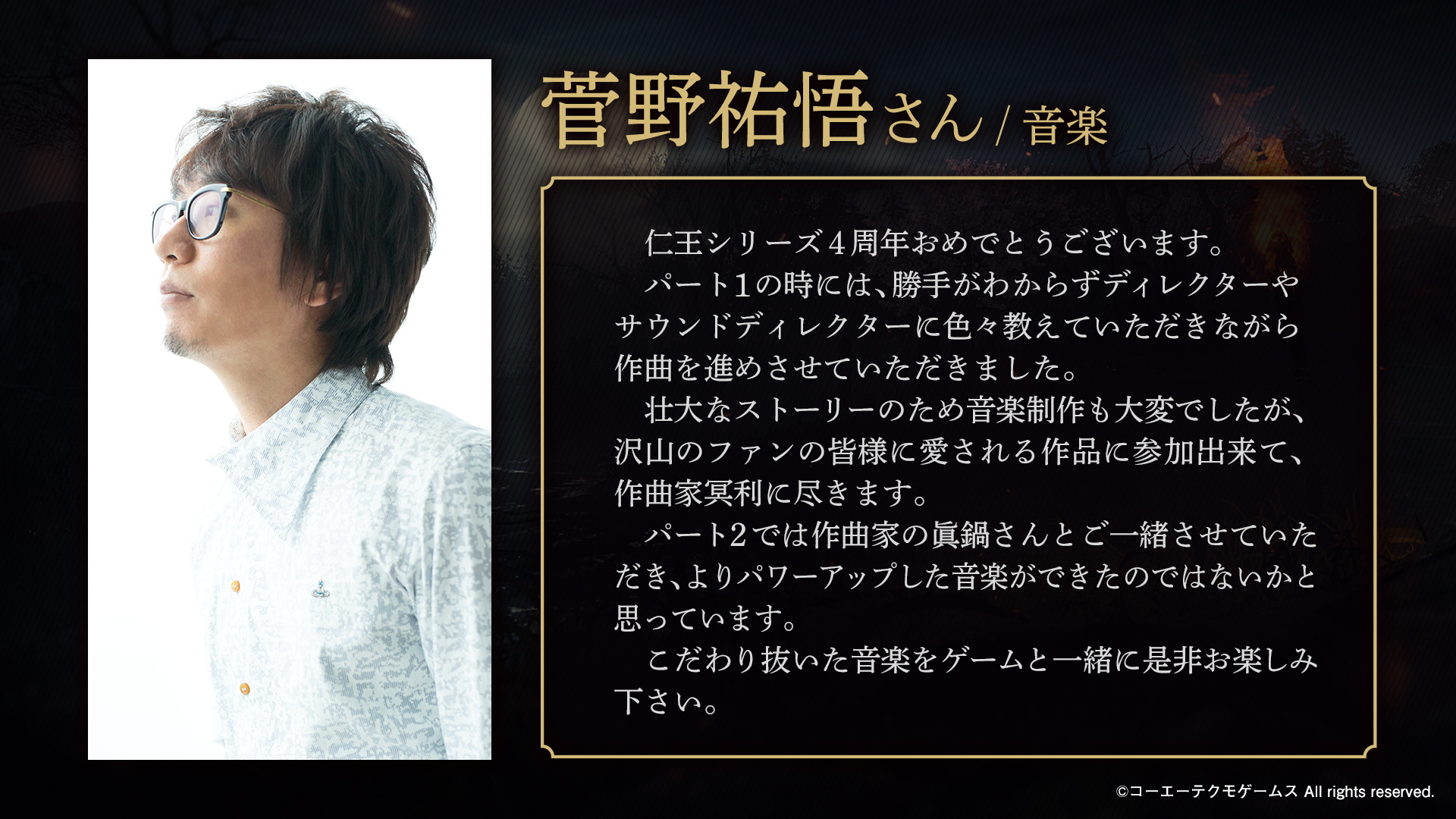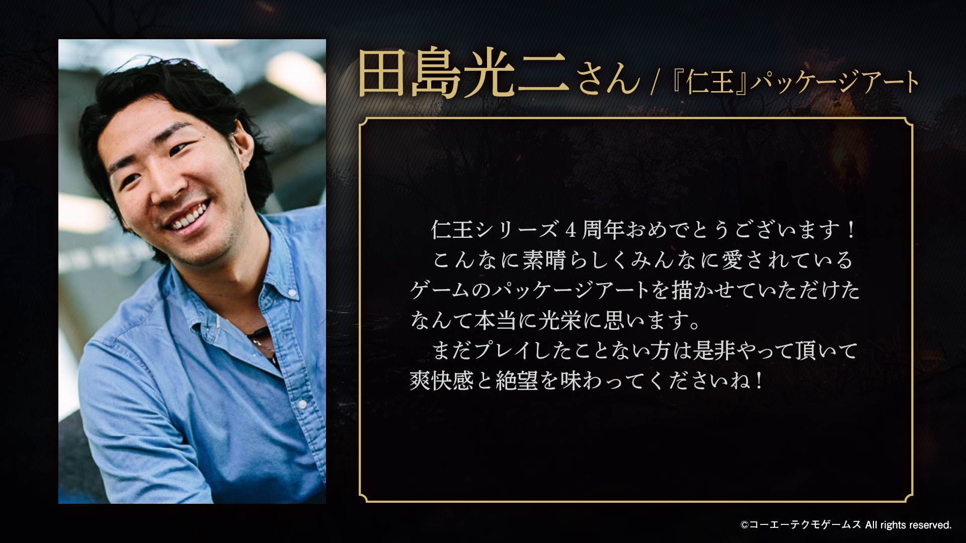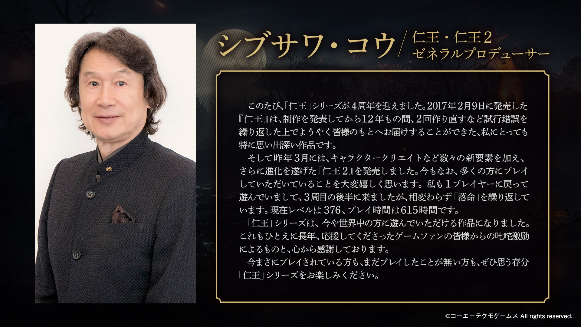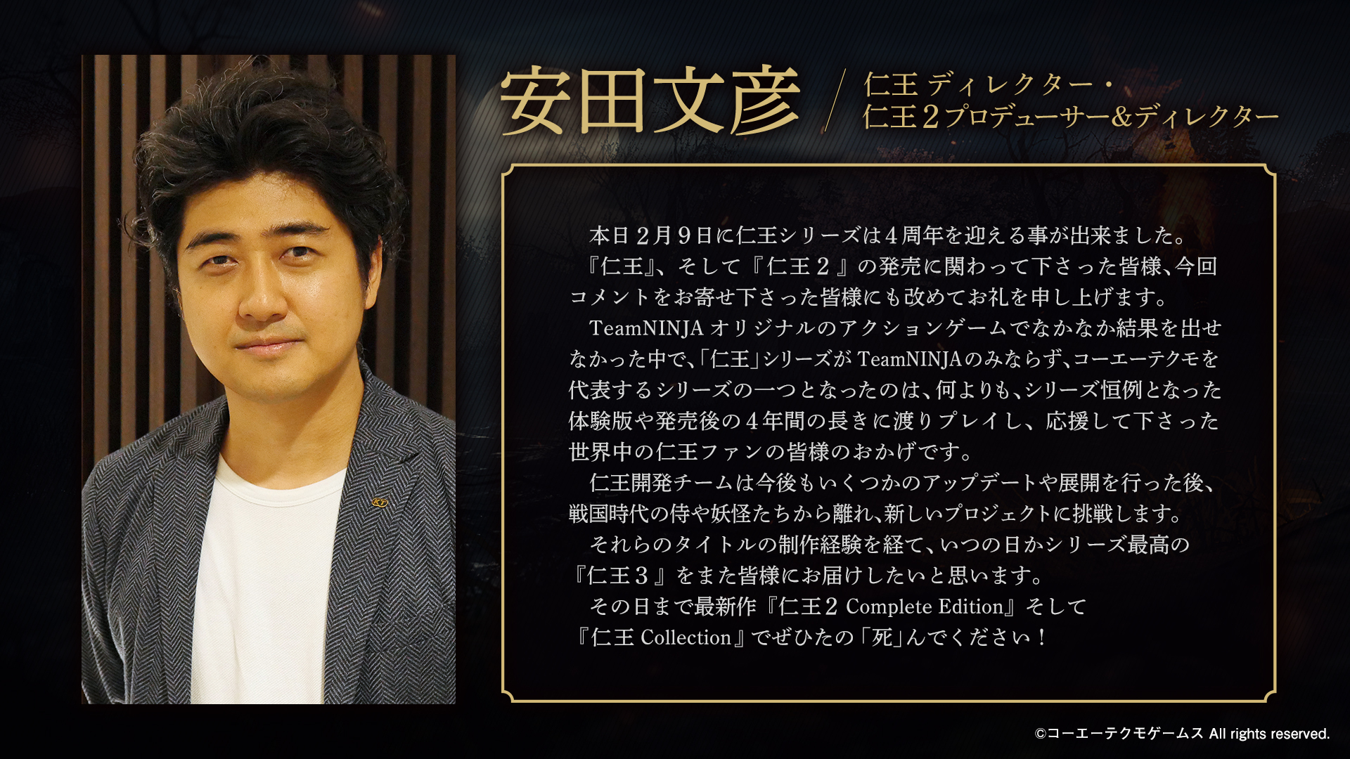 4周年おめでとうございます。 「仁王」というタイトルが発表されてから、今回のコンプリートエディションに至るまでかなり長い歴史があります。そう考えると4周年以上ですね。 多くの人に愛されている作品でもあります。 仁王3も楽しみにしております。 #仁王シリーズ4周年