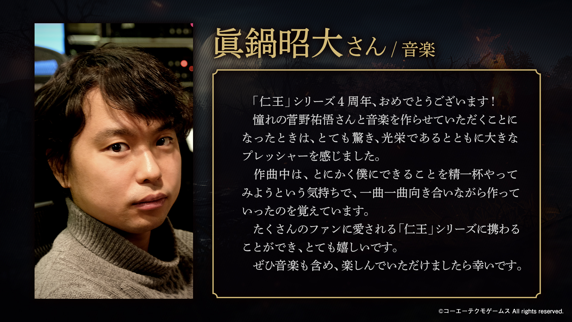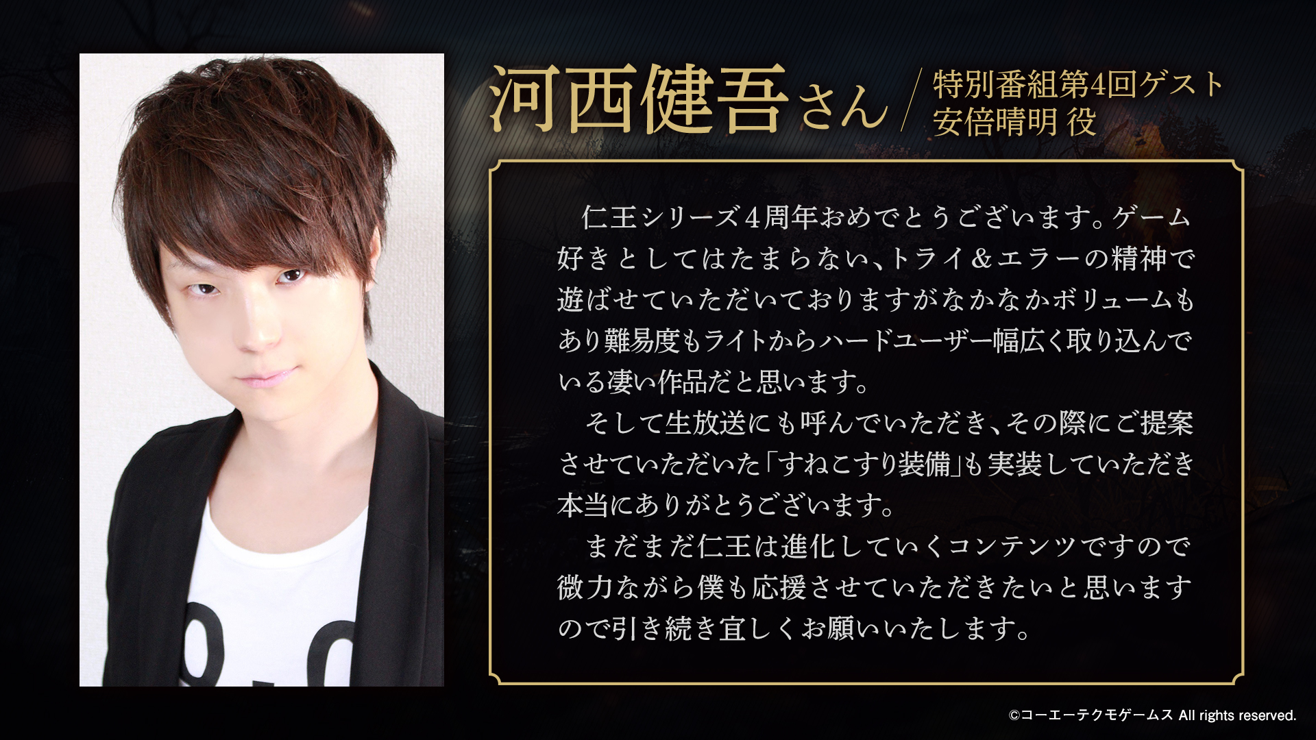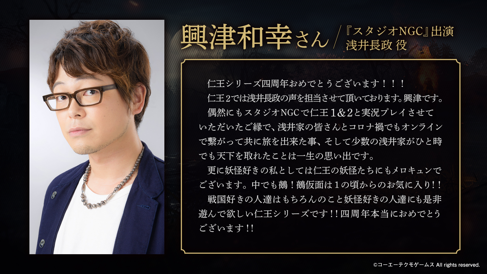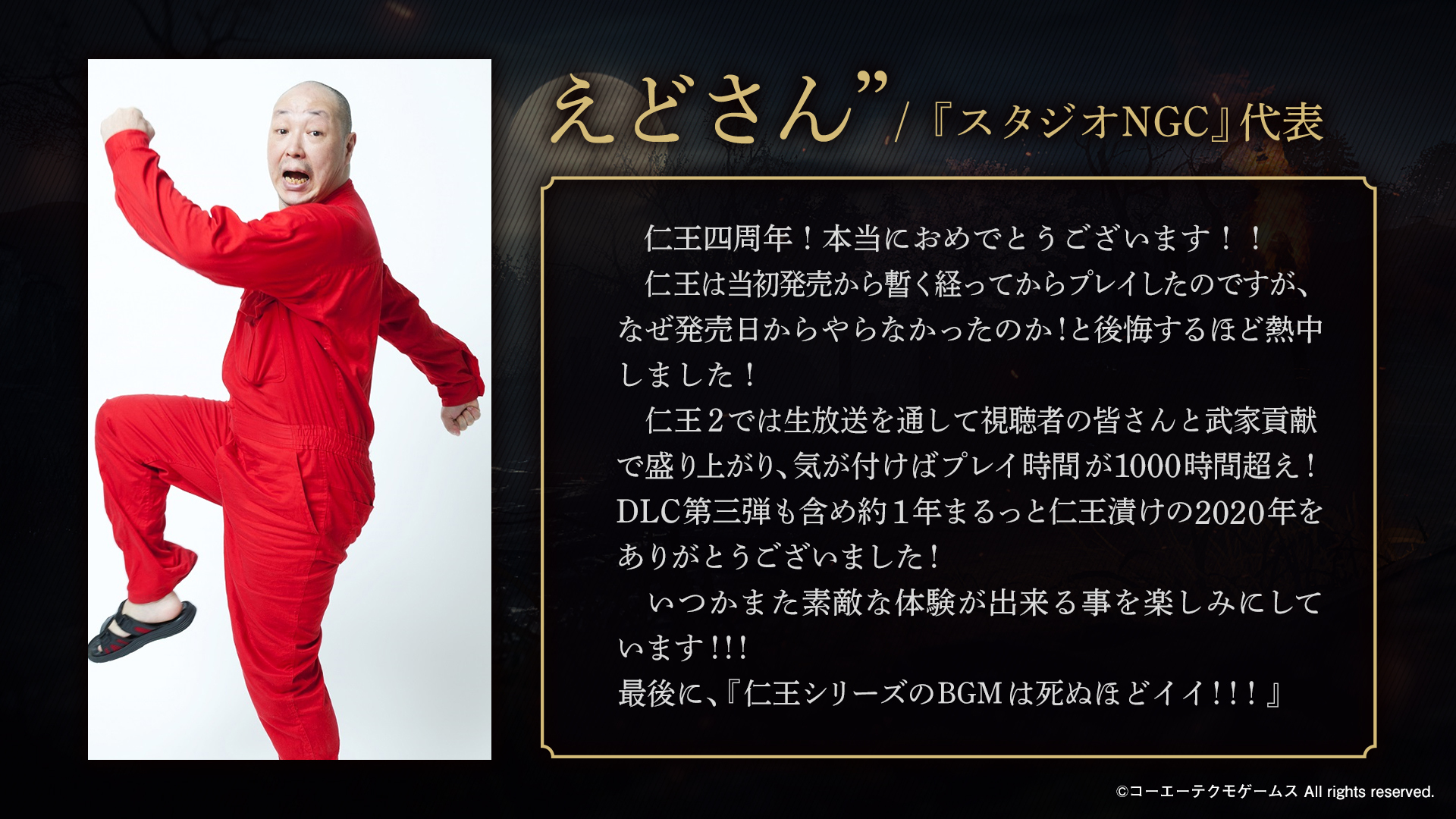 4周年おめでとうございます。 「仁王」というタイトルが発表されてから、今回のコンプリートエディションに至るまでかなり長い歴史があります。そう考えると4周年以上ですね。 多くの人に愛されている作品でもあります。 仁王3も楽しみにしております。 #仁王シリーズ4周年